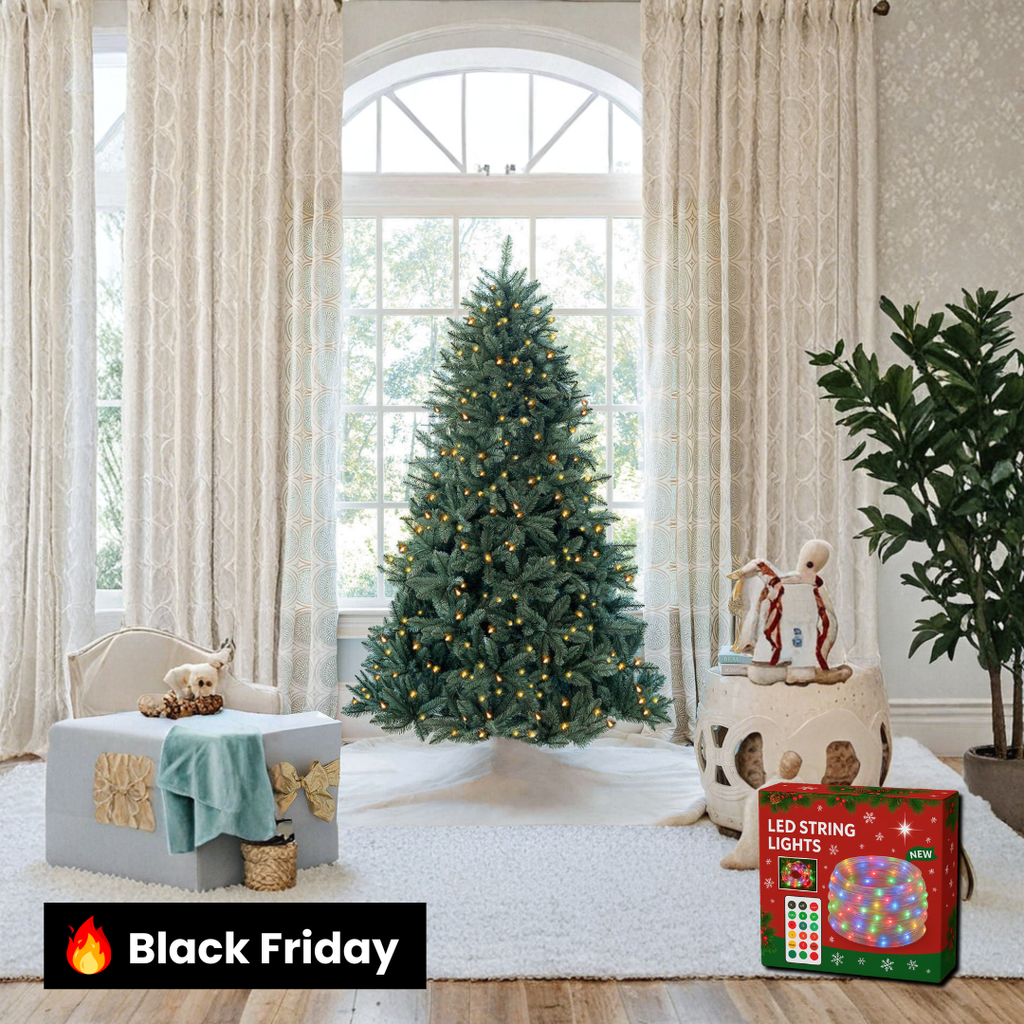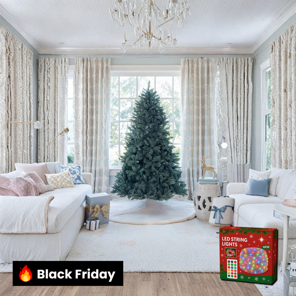 ✨ Especificações Técnicas Altura: 2,15 m (7 pés) Diâmetro da base (aprox.): 1,35 m Número de galhos (tips): 2.400 Número de LEDs: 550 micro LEDs de luz morna embutidos Material: galhos em PVC premium com estrutura metálica reforçada Cor: Azul-esverdeado (efeito Blue Spruce natural) Montagem: sistema de galhos articulados com base metálica inclusa Iluminação: micro LEDs de baixo consumo (luz morna suave) Uso recomendado: ambientes internos (residenciais e corporativos) Densidade dos galhos: alta (visual cheio, equilibrado e natural)