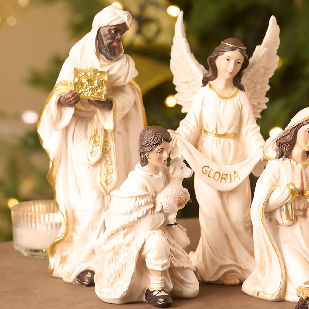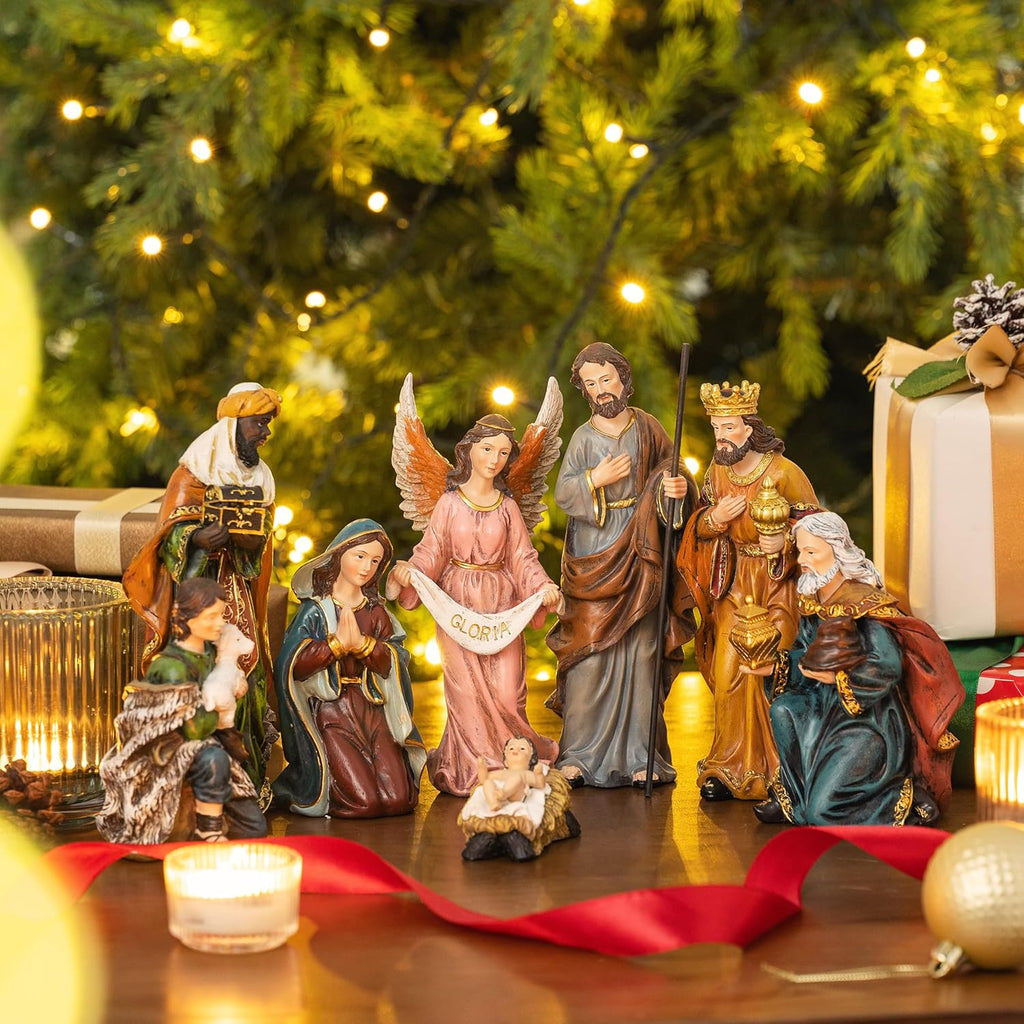 ✨ Especificações Técnicas Quantidade: 8 peças (Maria, José, Menino Jesus, anjo, reis magos e animais) Altura média das figuras: 20 cm Material: resina de alta qualidade com pintura manual detalhada Cores predominantes: vermelho, dourado e verde clássico Acabamento: brilhante com nuances envelhecidas (efeito artístico) Uso recomendado: ambientes internos (salas, mesas, capelas e altares) Estilo: clássico e religioso Peso aproximado: 2 kg